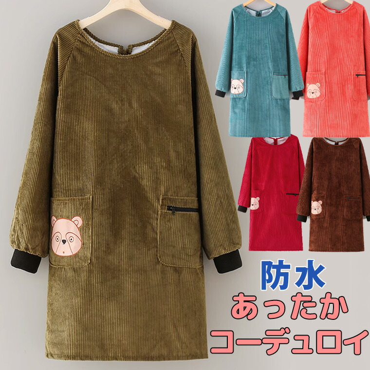 防水 あったかお洒落なコーデュロイ 袖口リブ 長袖エプロン 割烹着 撥水 裏ボア 袖カバー 腕カバー 冬用エプロン 冬 あたたかい フリース クマ ロング ルモック ロング丈 暖かい