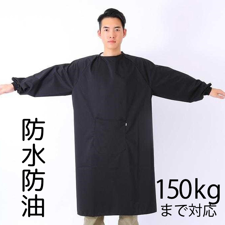 150の方まで 特大サイズ メンズエプロン メンズ 割烹着 汚れ防止加工 袖あり 長袖 黒 ブラック 防水 防油 汚れ防止 袖口ゴム 大きいサイズ 男性用 男性