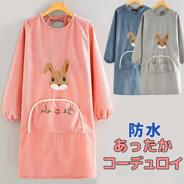 うさぎモチーフが可愛い エプロン ポケット付き 動物柄 うさぎ コーデュロイ 型 キャンプエプロン ワンピース風 フリル アウトドア オシャレ業務用 料理教室 保育士 キッチンサロン ワークエプロン