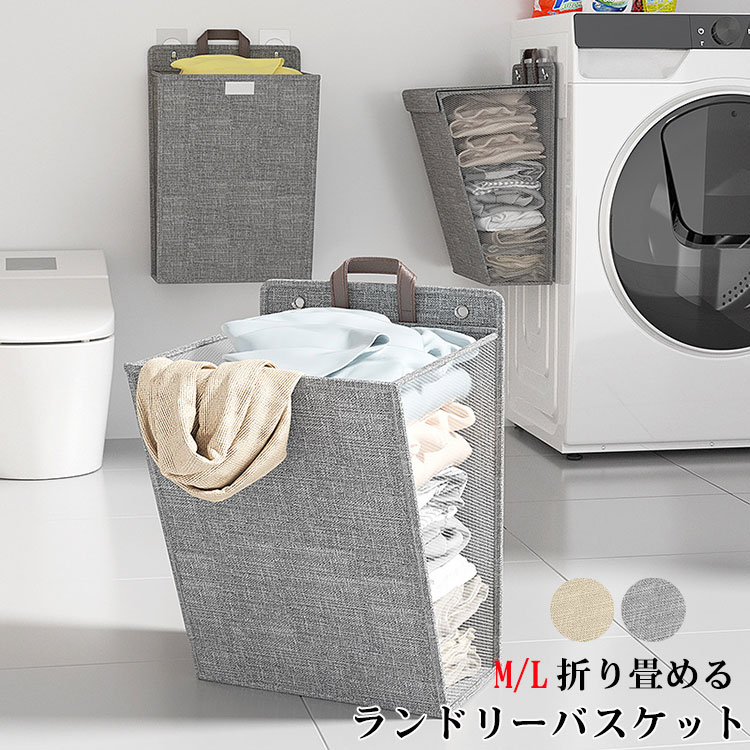 ランドリーバスケット 綿麻 軽量 通気 大容量 折り畳み式 フタつき 洗濯かご 雑貨かご 小物入れ 収納バスケット 粘着フック付き 壁掛け 洗濯機横に省スペースで収納 水洗い可能 シンプル グレー ベ