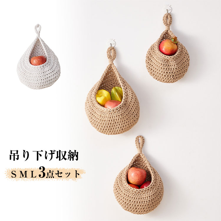 吊り下げバスケット 3個セット キッチン収納かご 綿素材 S M L 収納バスケット ロープバスケット フルーツバスケット 壁掛け用バスケット ウォールポケット キッチン収納 小物入れかご インテリア