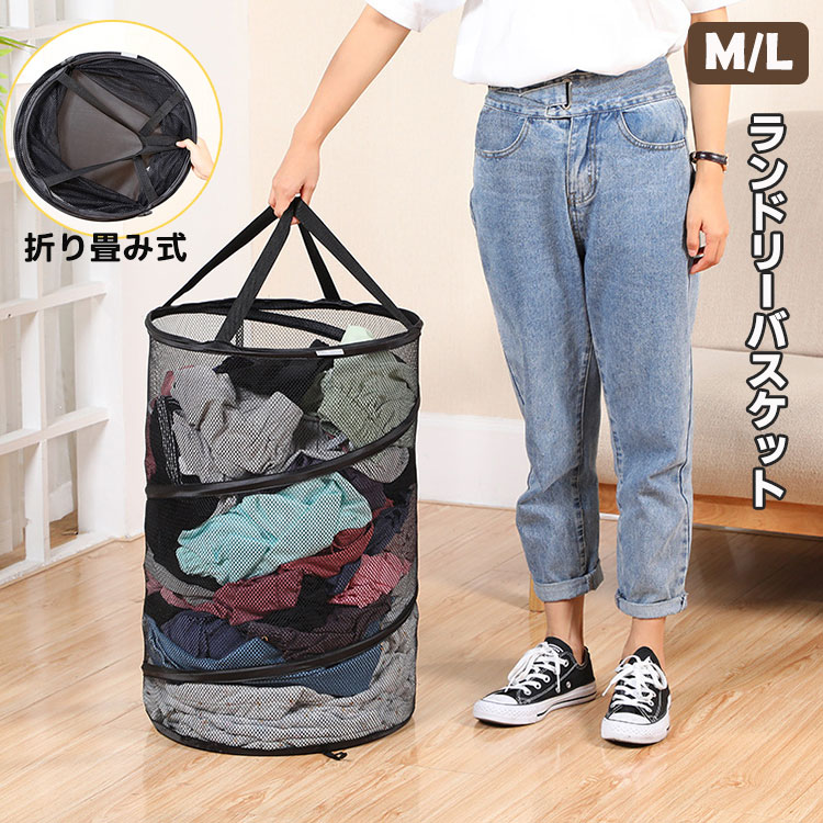 折り畳み式 ランドリーバスケット ブラック 黒 メッシュ 通気 シンプル 大容量 軽量 丈夫 洗濯かご 雑貨かご 小物入れ 収納バスケット コンパクト収納可能 多機能 洗濯籠 持ち運び可能 M L