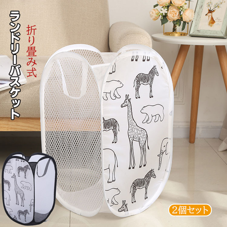 2点セット 折り畳み式 ランドリーバスケット 白 黒 おしゃれ 動物柄 軽量 丈夫 メッシュ 通気 洗濯かご 雑貨かご 小物入れ 収納バスケット コンパクト収納可能 多機能 洗濯籠 旅行 持ち運び可能