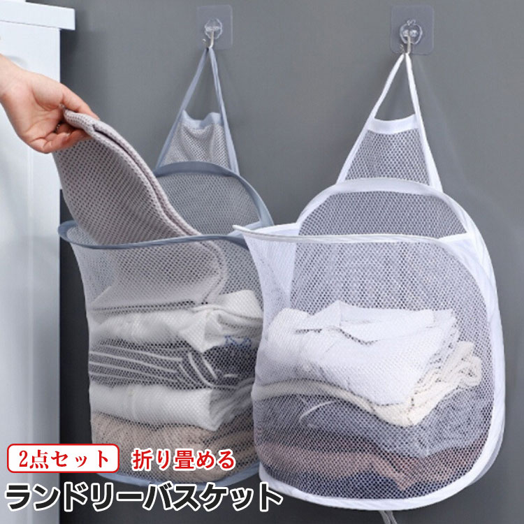 折り畳み式 ランドリーバスケット 2点セット 軽量 メッシュ 通気 洗濯かご 雑貨かご 小物入れ 収納バスケット 粘着フック付き 壁掛け 洗濯機横に省スペースで収納 水洗い可能 シンプル グレー 白