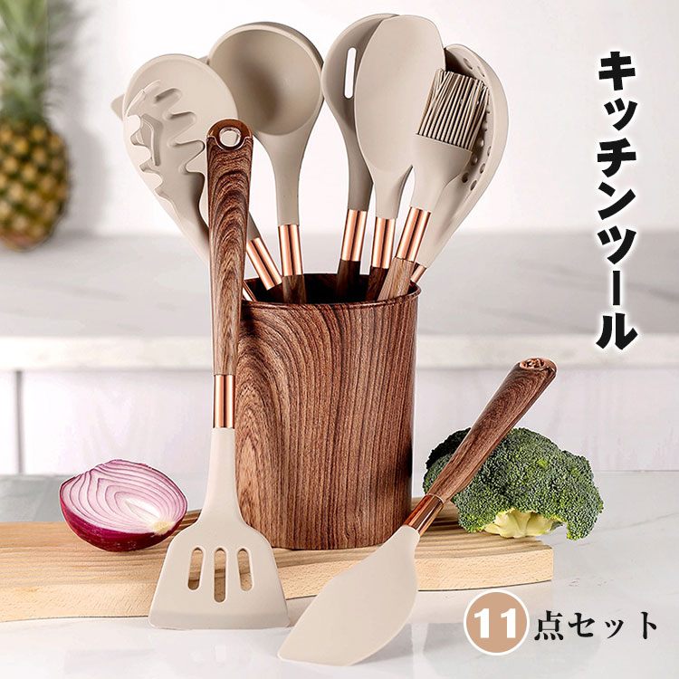 キッチンツール セット 調理器具 台所用品 耐熱シリコン 木製ハンドル 食洗機対応 傷つかない フライ返し おたま 泡立て器 スプーンなど11点セット 収納しやすい ツールスタンド付き 北ヨーロッパ風