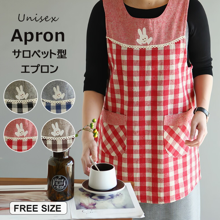 子供が喜ぶかわいいうさぎ柄xチェック ♪4色展開 エプロン 大人用 おしゃれ 保育士 かぶり チェック チュニック サロペット型エプロン うさぎ かわいい ポケット付き レディースエプロン 看護師 家