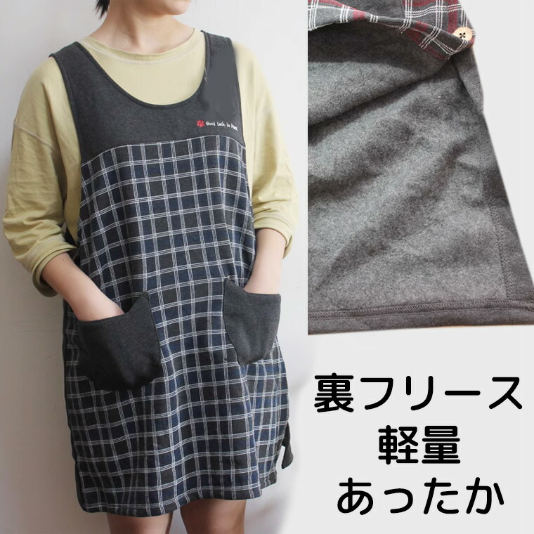 洋服感覚のエプロン 裏フリース 裏起毛トレーナー 着心地抜群 被るだけ シンプル可愛い エプロンワンピース ミドル丈 ポケット ゆったり ノースリーブ 重ね着 Aライン 紐なし 韓国 フレア おしゃれ