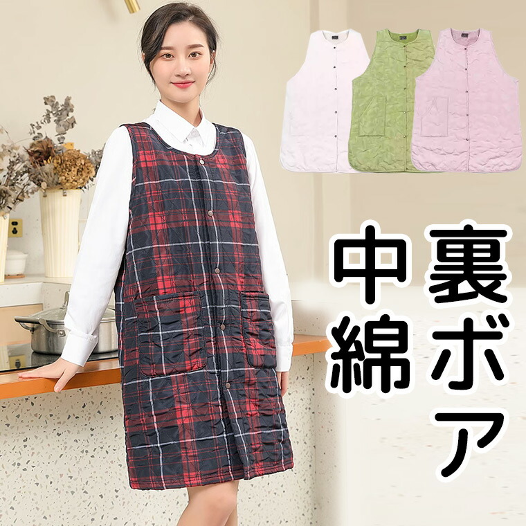 裏ボア中綿 超あったか袖なしエプロン 大きなポケット サイドボタン サイドオープン 横ボタン 割烹着 防水 撥水 裏ボア 冬用エプロン 冬 あたたかい フリース ロング丈 暖かい 裏起毛