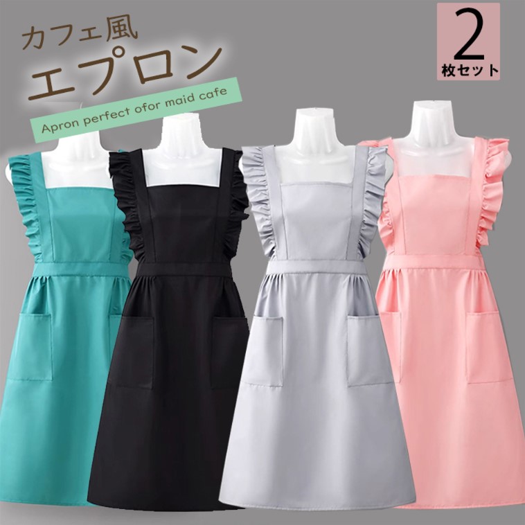 おしゃれなパーティーにもぴったり 4色展開 2枚セット ラブリー エプロン ワンピース風 カフェエプロン フリル キッチン雑貨 後ろ結び 料理教室 新婚さんエプロン 制服 作業用 ママさん