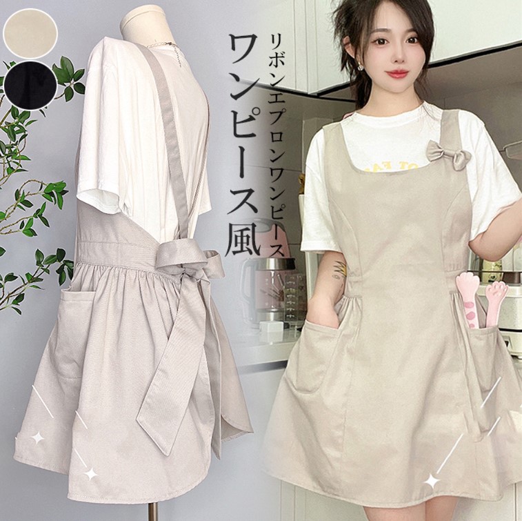 Aラインデザインが女性らしい印象を与えます 2色展開 ラブリー エプロン ワンピース風 カフェエプロン フリル キッチン雑貨 後ろ結び 料理教室 新婚さんエプロン 制服 作業用 ママさん