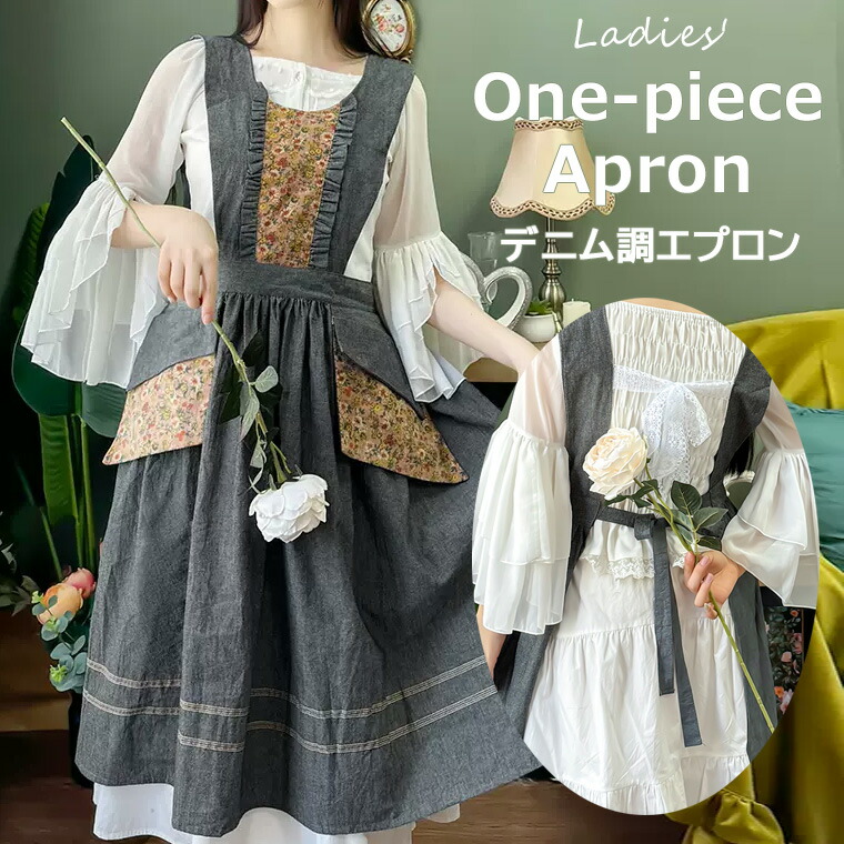 花屋とカフェの雰囲気があるオシャレなデザイン ♪2色展開 デニム調 花柄 エプロン フリル 小花 ポケット付き おしゃれ 型 重ね着風 花屋 メイド プリンセス レトロ プレゼント ワンピース