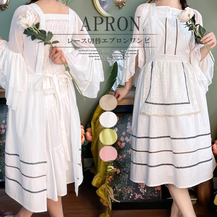 花屋とカフェの雰囲気があるオシャレなデザイン 4色展開 レース切替 エプロン メイド風 カフェエプロン H型 ポケット付き おしゃれ 重ね着風 花屋 メイド プリンセス レトロ プレゼント ワンピース
