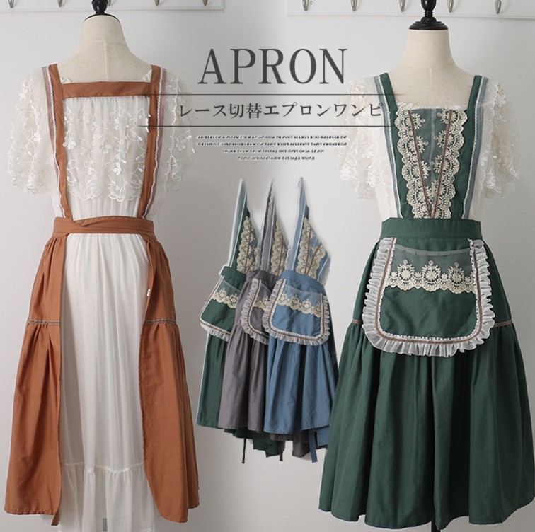 花屋とカフェの雰囲気があるオシャレなデザイン 4色展開 レース切替 エプロン メイド風 カフェエプロン 型 ポケット付き おしゃれ 重ね着風 花屋 メイド プリンセス レトロ プレゼント ワンピース