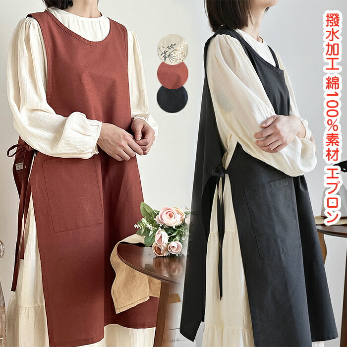 エプロン レディース 撥水 綿100% 2Way かわいい ベストエプロン ロング丈 花柄 無地 北欧風 ポケット付き ワンピース風 ゆったり シンプル 大きいサイズ 肩掛け おしゃれ カフェ風