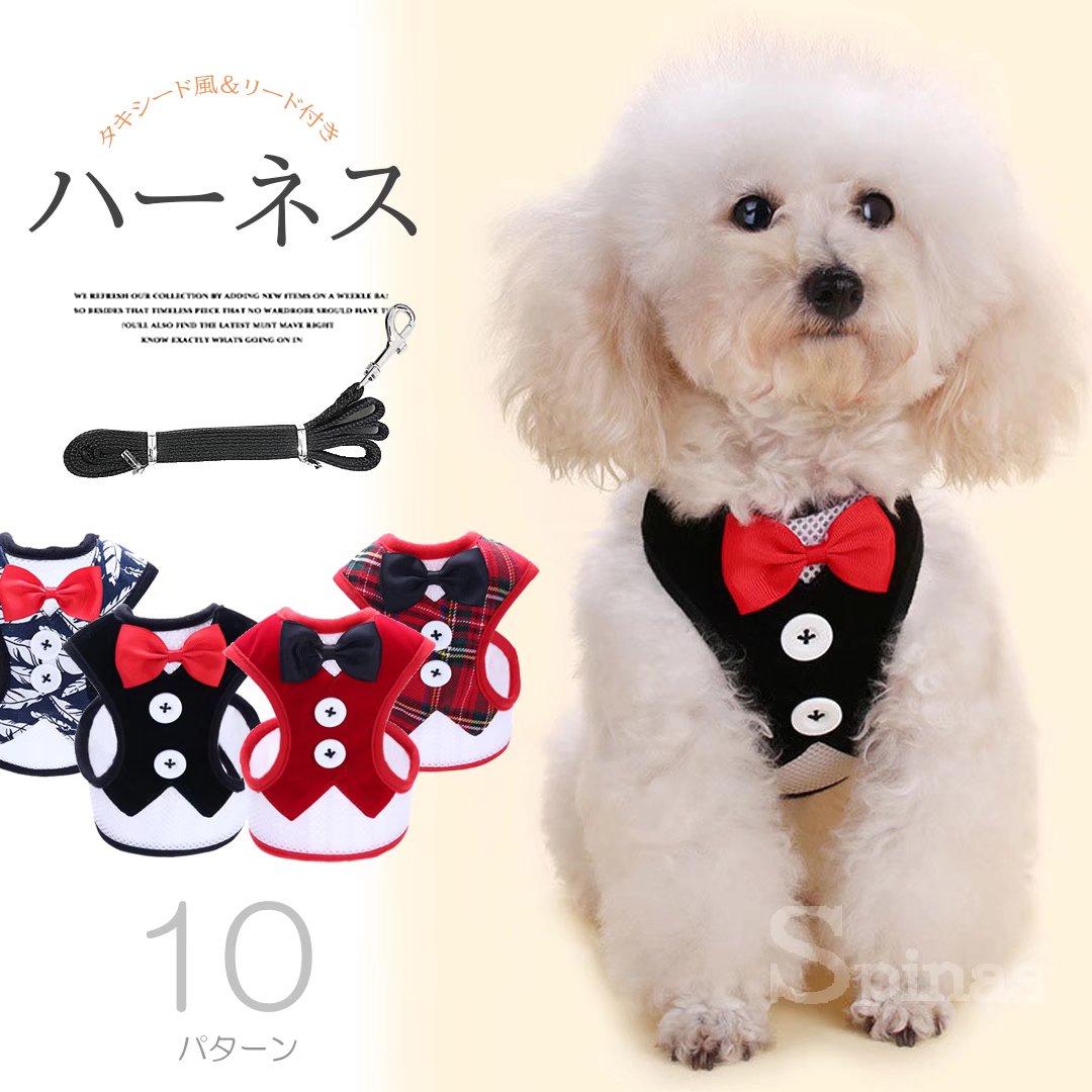 散歩することも楽しくなる ハーネス リード 2点セット 胴輪 タキシード風 紳士スーツ ボウタイ付き ベスト型 ペット用品 ペットグッズ