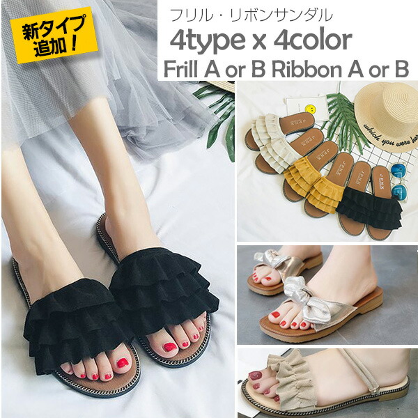 3A18 フラットサンダル かわいい フリル リボンサンダル ローヒール 美脚靴ビーチサンダル レディース リボン 夏 トレンド ぺたんこ