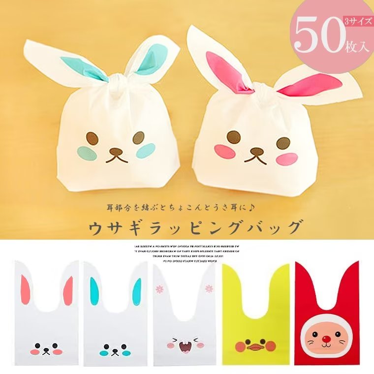 飛び出した耳がかわいいうさぎのデザイン 50枚入り うさぎの耳形袋 ギフトふくろ ウサギ袋 XS S M L XL プラスチック袋 ギフトプレゼントバッグ 小分け収納 お菓子袋