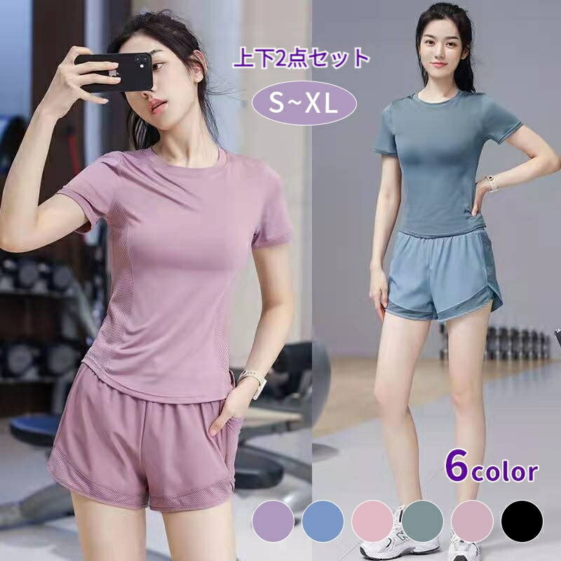 スポーツウェア レディース セット ヨガウェア ヨガ 上下セット ランニングウェア ウォーキング トレーニングウェア トップス 半袖 ショートパンツ Tシャツ フィットネスウェア S M L XL