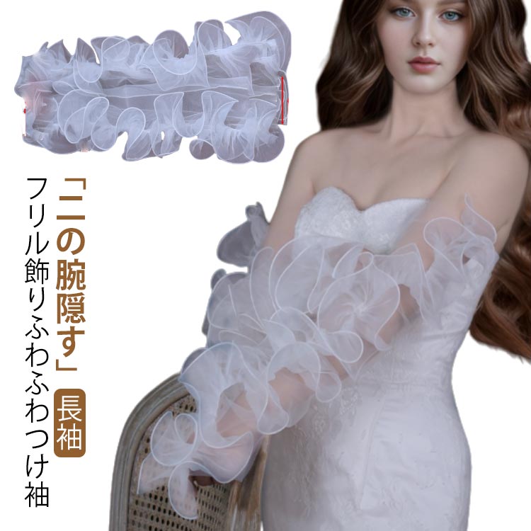 二の腕 パーティードレス用 ふんわり ソフトチュール ウェディングドレス用 ドレス 長袖 アームカバー フリル アームドレス ゴム留め ホワイト ふわふわつけ袖 付け袖 ワンピース用 ブライダル 隠し