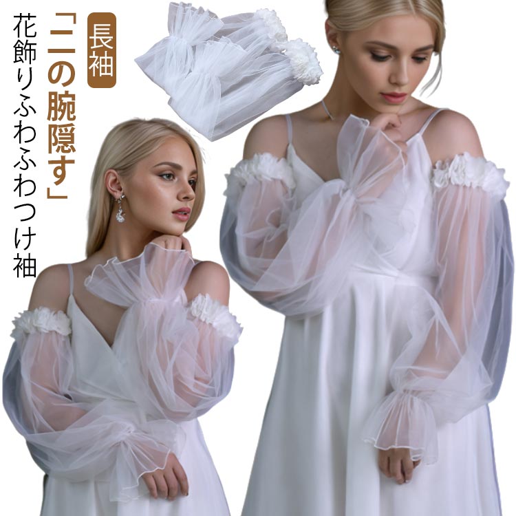 長袖 ドレス 付け袖 ゴム留め ソフトチュール パーティードレス用 アームカバー 隠し アームドレス ホワイト ふんわり 二の腕カバー 二の腕 花飾り ブライダル ウェディングドレス用