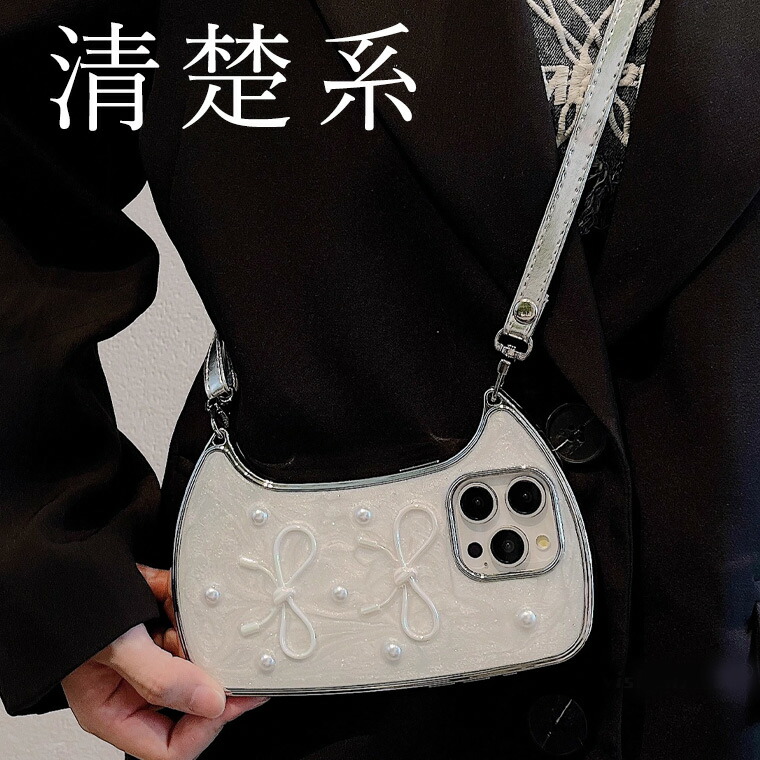 清楚系上品ホワイト お嬢様風 高見え スマホショルダー ブランド リボン パール 白色 シンプル 個性的 ロリータ 原宿系 原宿 韓国ファッション レディース シリコン iphone15 iphone