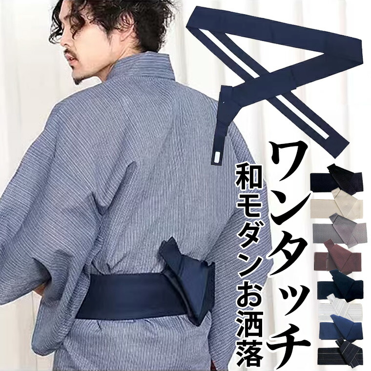 ワンタッチで初心者の方でも締めやすい 選べる20柄 浴衣帯 メンズ 角帯 ワンタッチ帯 マジックテープ 作り帯 紺黒系 縞柄 着物 浴衣 男帯
