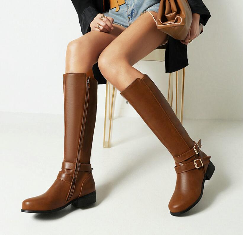 ジョッキーブーツブーツロングブーツ 秋冬レディース ベルトつき ポインテッドトゥ 太ヒール 6センチ長靴ハイヒール チャンキーヒール