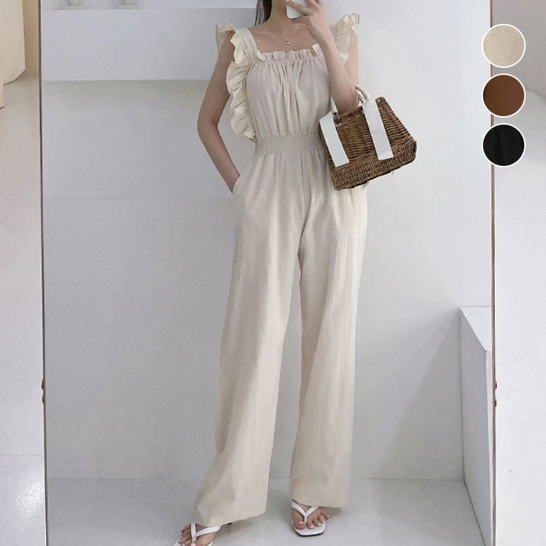 ジャンプスーツ フリル 麻 ストリートファッション スクエアネック フリルスリーブ ウエストマーク