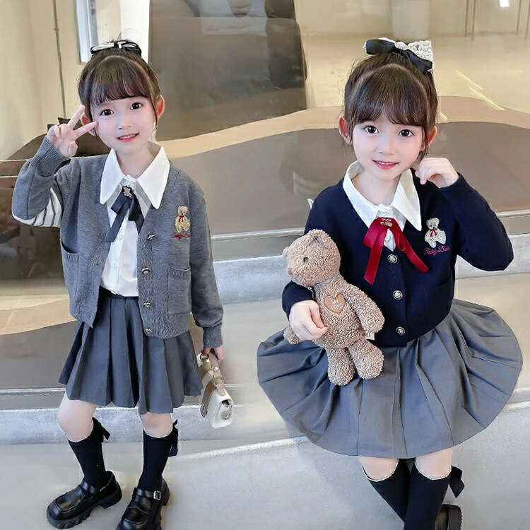 小学校 女の子制服3点セット ジャケットなし制服 スクールカーディガン 上下セット スカートスーツ ジュニアスーツ 可愛い プリーツスカート リボン付き 制服 学校制服