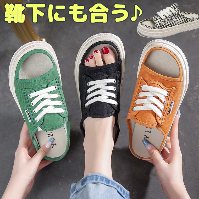 冷え性の方にも スニーカーサンダル 40代 50代 サンダル レディース 靴下 素足 オープントゥ キャンバス 帆布 靴紐 歩きやすい 疲れにくい かかとなし スリッポン スポーツサンダル コンフォー
