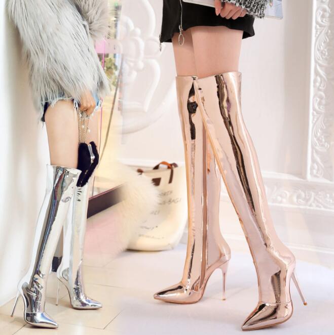 レディースブーツニーハイブーツエナメル12cm超ハイヒール光沢ロング丈秋冬春秋サイハイブーツ大きいサイズ