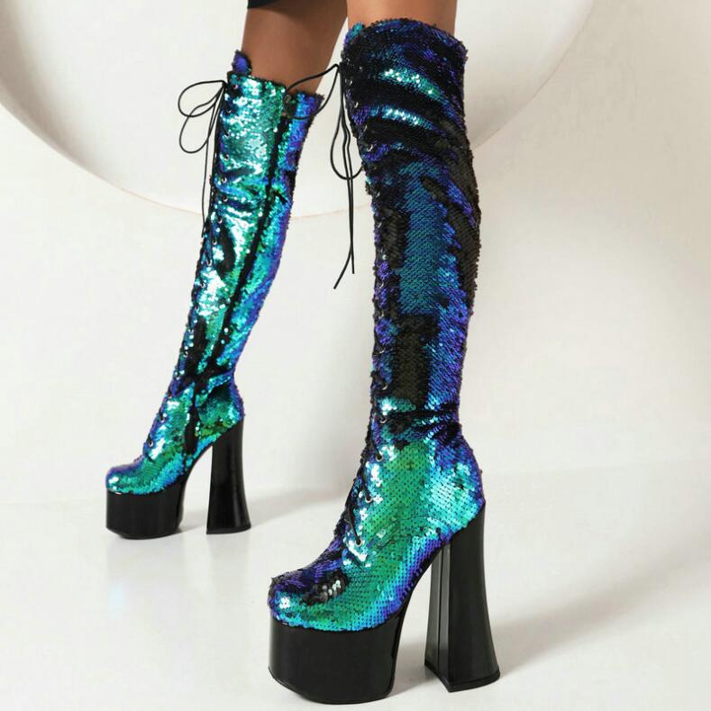 レディースブーツロングブーツ編み上げブーツ15センチキラキラ超ハイヒール光沢ロング丈秋冬春秋サイハイブーツ