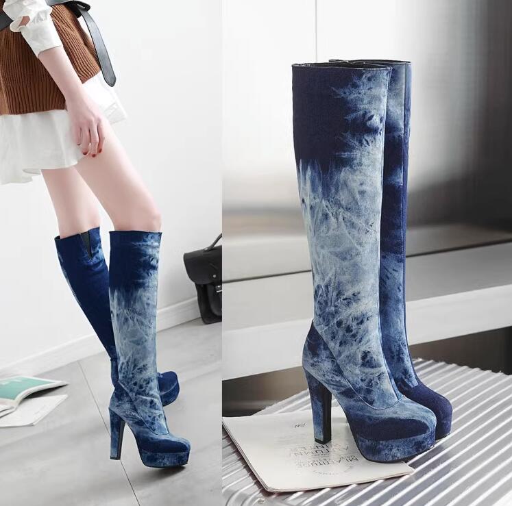 厚底ブーツ ロングブーツ デニムブーツ 美脚 ブーツ コスプレ 太ヒール 靴 レディース 女性 カジュアル 靴 シューズ 秋 冬