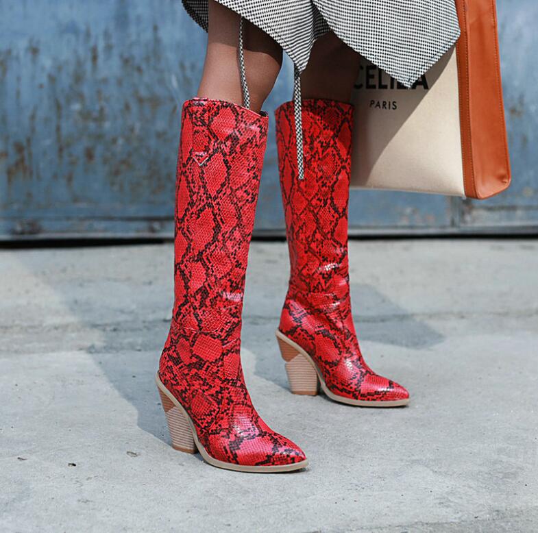 ジョッキーブーツパイソン柄 ブーツロングブーツ 秋冬レディース ブーツ ポインテッドトゥ 太ヒール 9センチハイヒール チャンキーヒール 歩きやすい