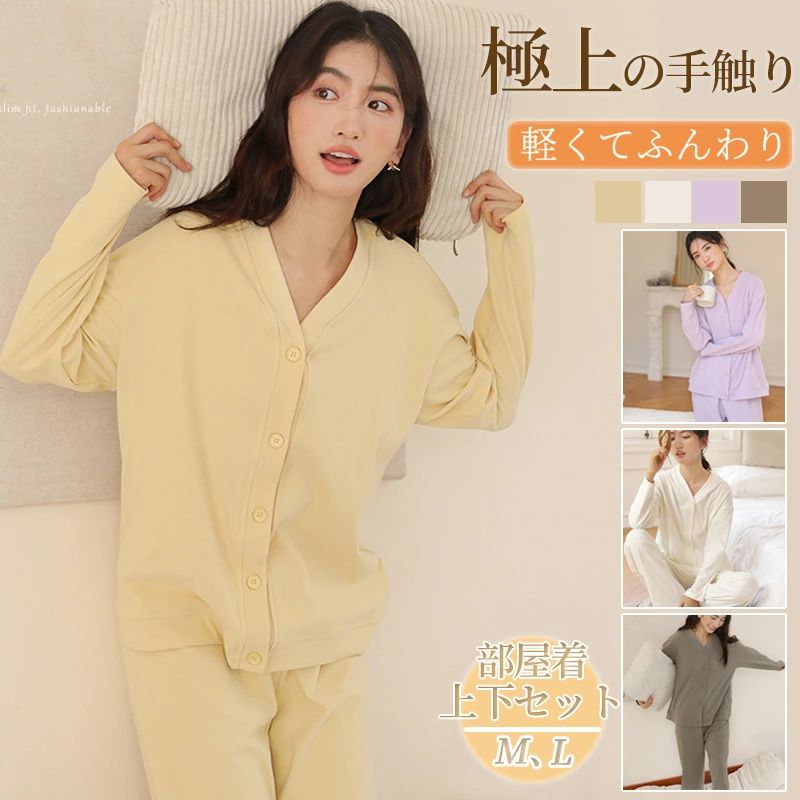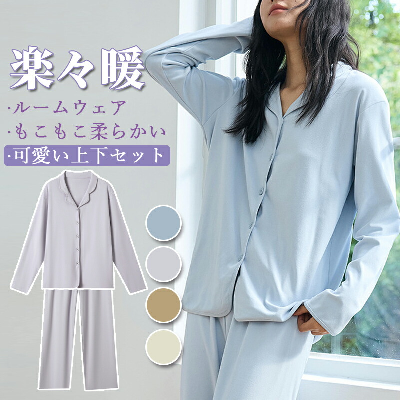 ルームウェア レディース 秋冬 上下 セット パジャマ 無地 前開き 長袖 ロングパンツ ゆったり シンプル ふんわり かわいい 寝巻 部屋着 おしゃれ ナイトウェア レディースファッション リラック