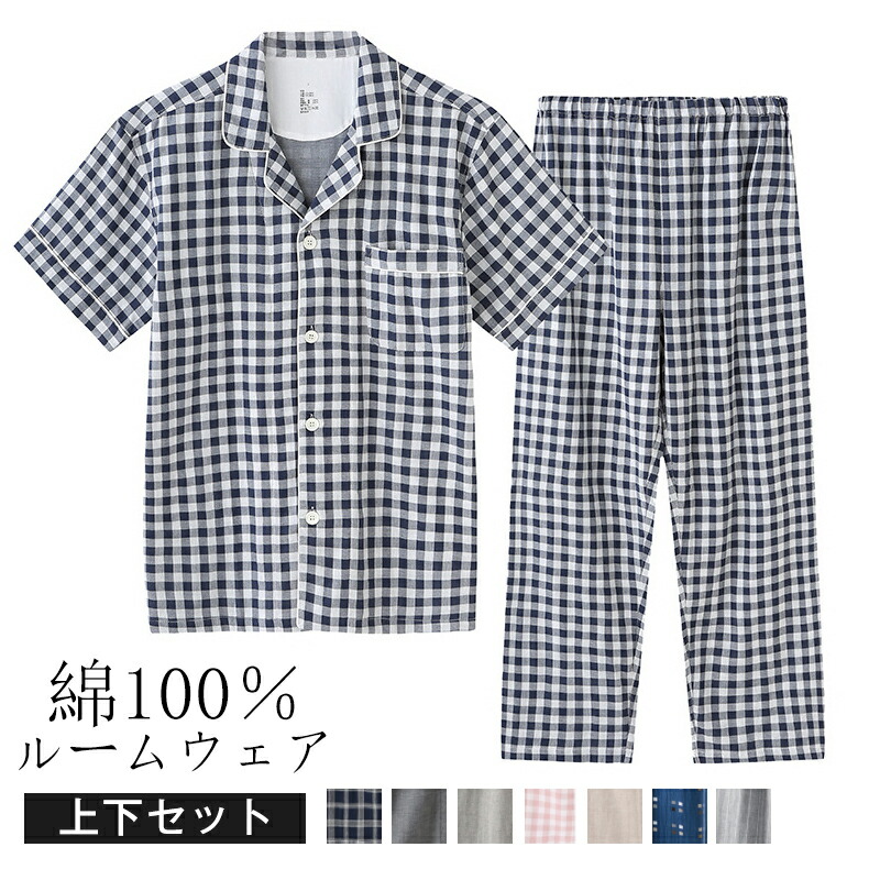 パジャマ メンズ レディース 綿100% お揃い 半袖 ルームウェア 上下セット ナイトウェア カップル 長パンツ 綿 チェック柄 前開き 2点セット 部屋着 寝間着 セットアップ