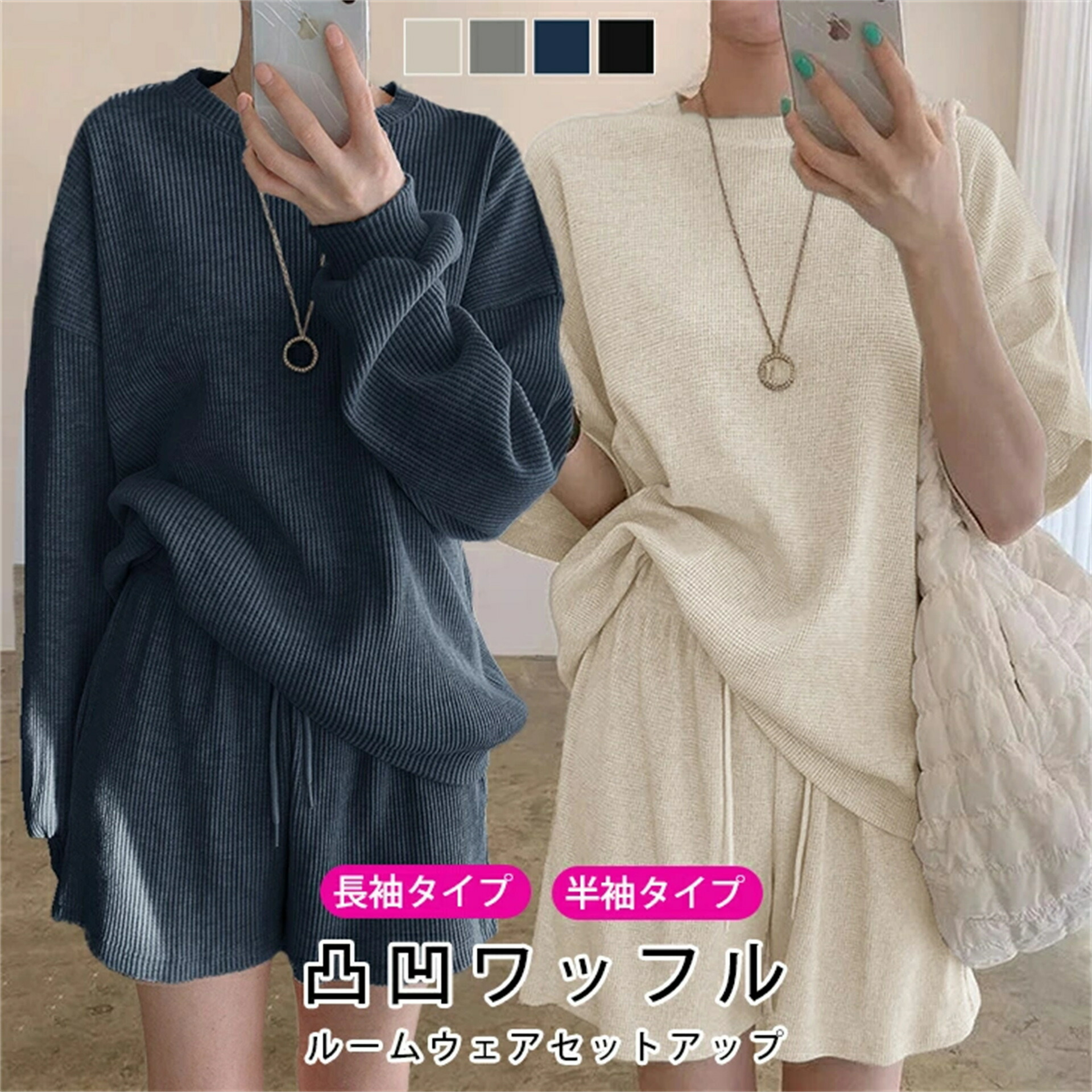 セットアップ レディース ルームウェア 上下セット ワッフル 長袖 半袖 ゆったり オーバーサイズ ショーツ カジュアル 韓国