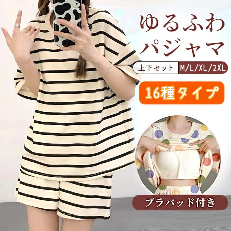 ルームウェア パッド付き レディース カップ付き パジャマ かわいい 上下セット 半袖Tシャツ ショートパンツ ねまき 寝間着 寝巻き ぱじゃま ナイトウェア ボーダー柄 ママ 部屋着 母の日 春夏