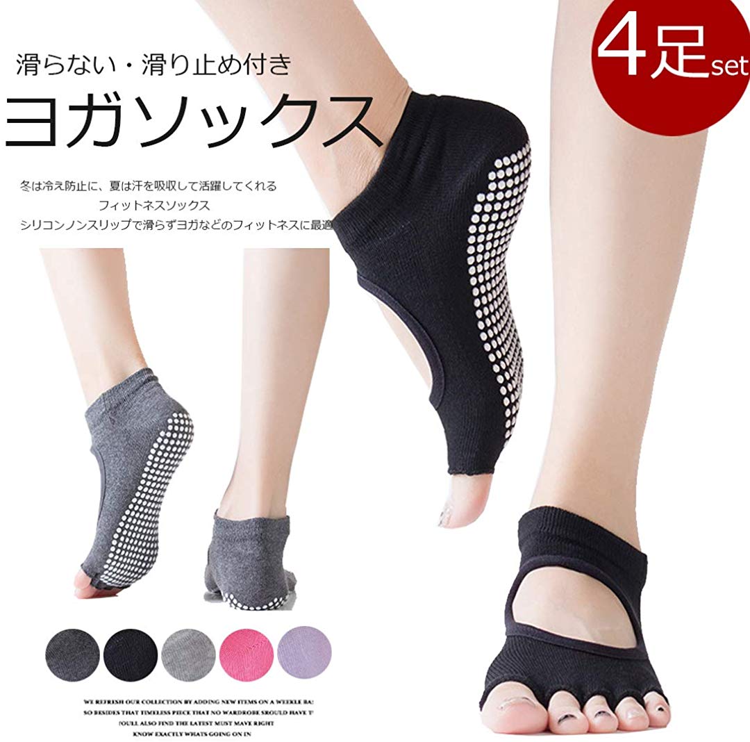 シリコンノンスリップで滑らない 4足セット ヨガソックス 滑り止め 5本指 ソックス フィットネスソックス 半指タイプ