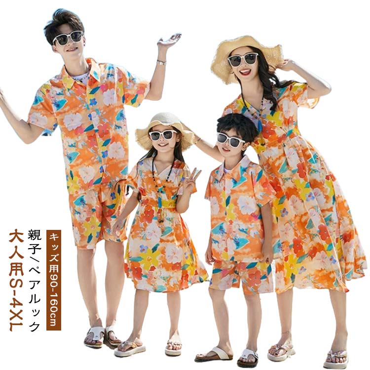 ペア 親子ペア 男の子 親子コーデ ワンピース ハーフパンツ 花柄 ペアルック ハワイ カップル 家族お揃い 上下セット パパ 女の子 アロハシャツ 半袖 旅 親子
