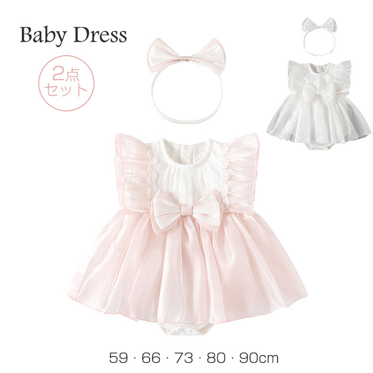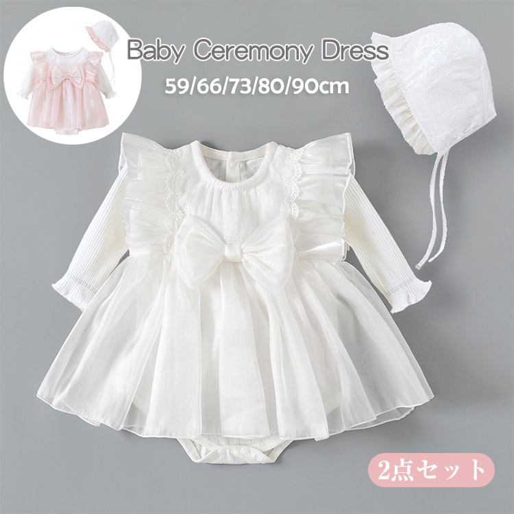 【送料無料】リボン付き チュール ベビー服 白 記念撮影 お食い初め 赤ちゃん ガーリー 華やか コットン 綿 やわらか 丸襟 スナップ 可愛い