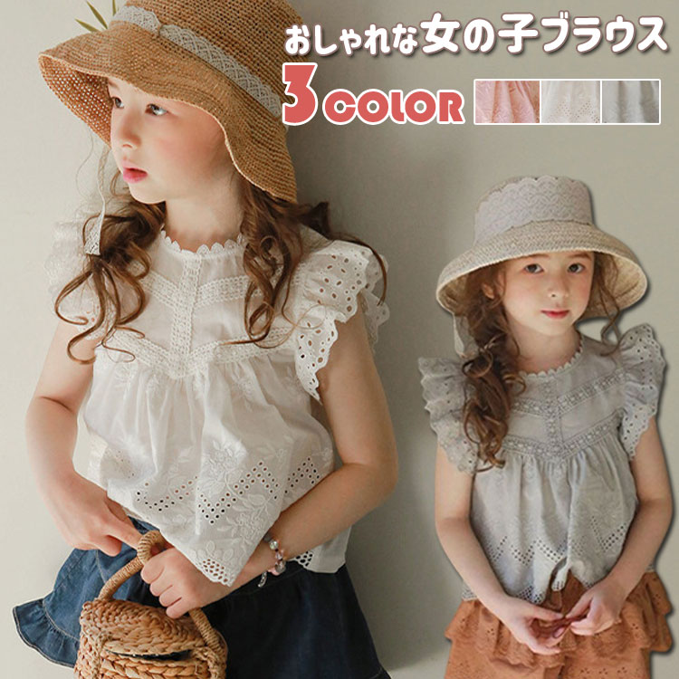 キッズ ブラウス 女の子 シャツ フォーマル レースブラウス おしゃれ ホワイト ピンク グレー 刺繍レース ノースリーブシャツ カジュアル 子供 女の子トップスキッズ ガールズ 結