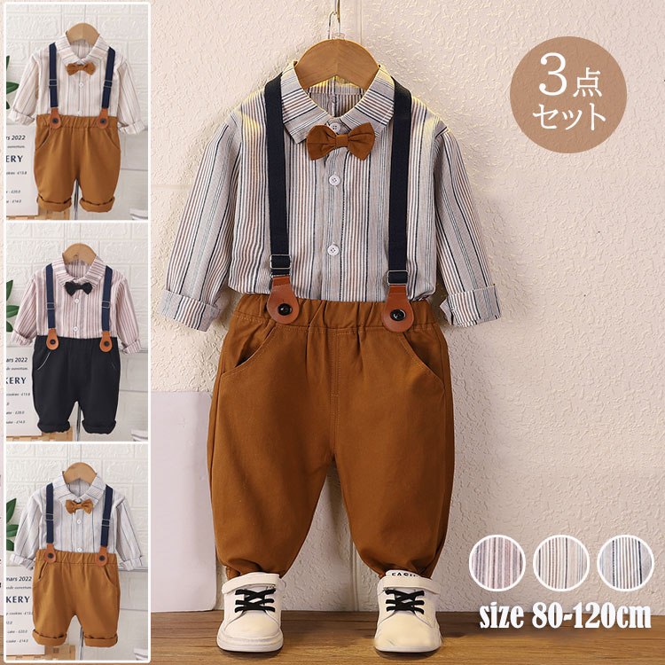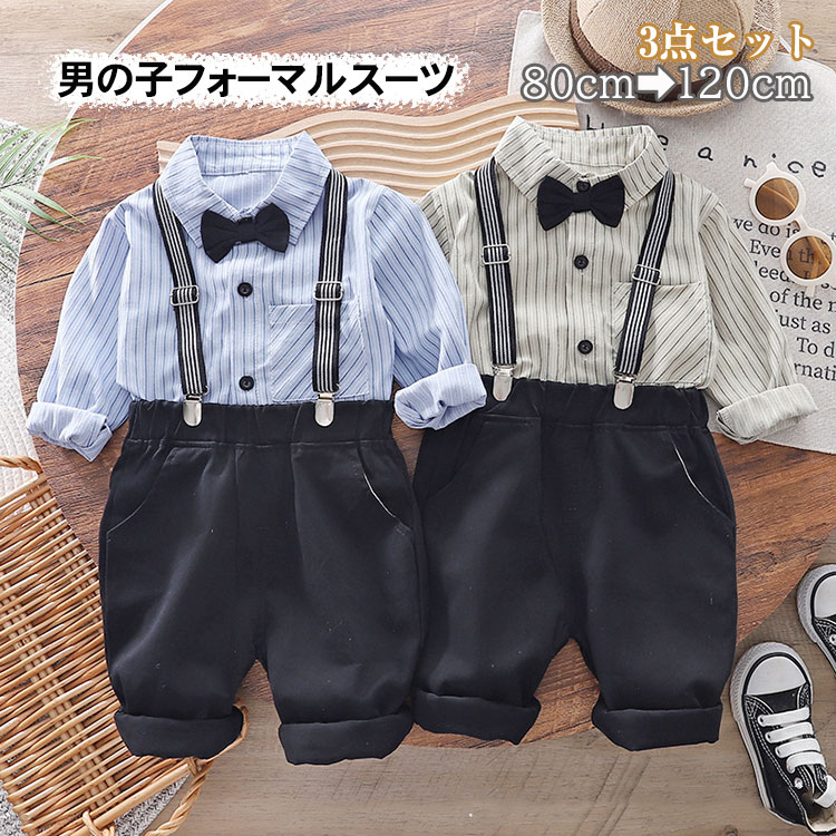 子供服 男の子 フォーマルスーツ 3点セット ベビースーツ ベビー服 七五三 蝶ネクタイ付き フォーマル ストライプ 長袖シャツ 長ズボン サスペンダー 上下セット 入園式 卒園式 誕生日 パーティー