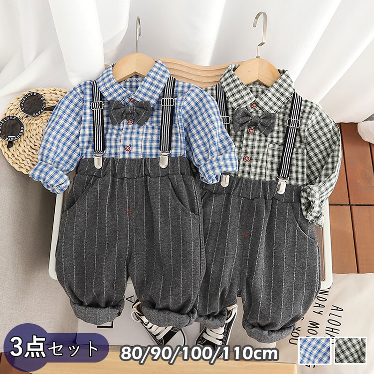 ベビースーツ セットアップ 男の子 子供服 フォーマルスーツ 3点セット ベビー服 七五三 蝶ネクタイ付き フォーマル チェック柄 長袖 シャツ ズボン サスペンダー 上下セット 入園式 卒園式 誕生