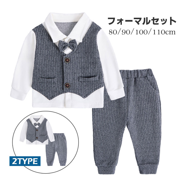 ベビー フォーマルスーツ 男の子 セットアップ 上下 80 90 100 110cm 長袖 蝶ネクタイ付き 洋服 2タイプ 無地 ストライプ ベビー服 パーティー 結婚式 誕生日 記念写真撮影 幼児