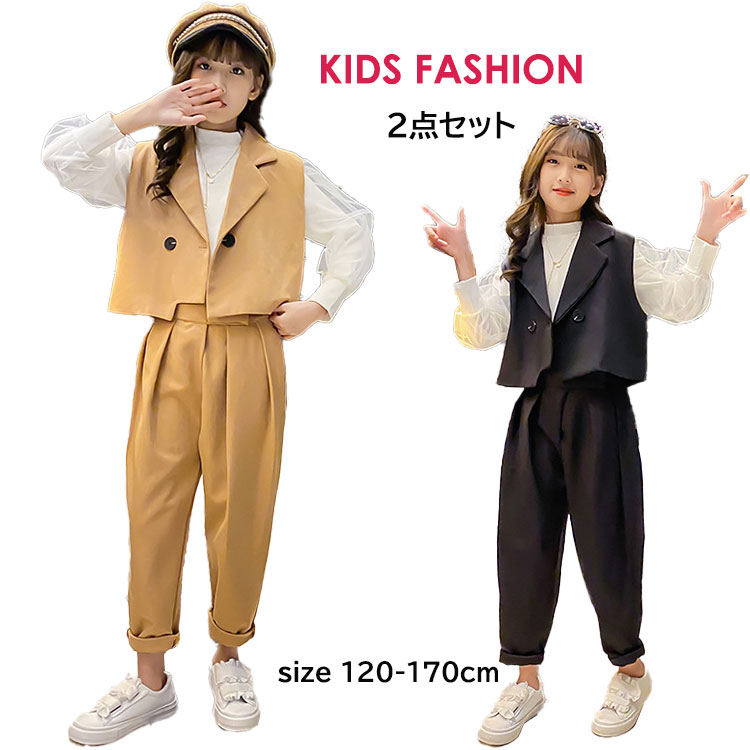 子供スーツ 女の子 2点セット 韓国ファッション 袖なし カジュアル スーツ パンツスーツ ジャージ 上下セット レジャー 子供服 120 130 140 150 160 170 ジュニア ダンス衣装