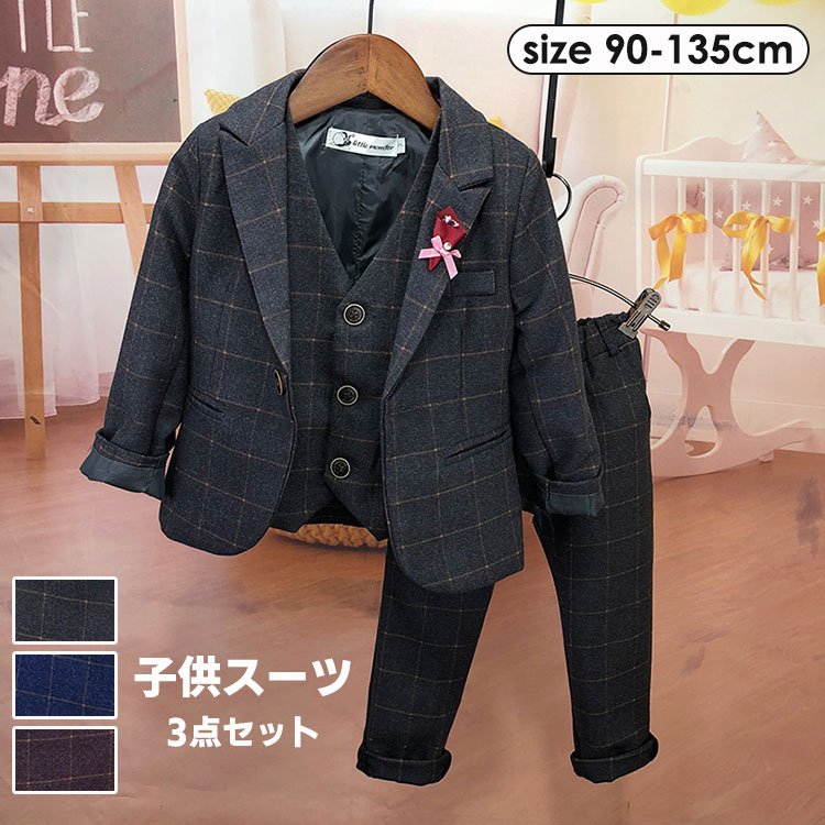男の子 チェック柄 カジュアルスーツ フォーマルスーツ 3点セット 子供スーツ キッズ 高品質 子供服 入学式 卒業式 紳士服 発表会 演奏会 プレゼント 90 100 110 120 130 135