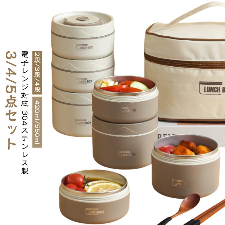 保温弁当箱 保温バッグ付き 断熱弁当箱セット 3/4/5点セット ステンレス製 お弁当箱 保温ランチジャー 漏れ防止 大容量 2段/3段/4段 420/550 ピクニック 通勤 通学