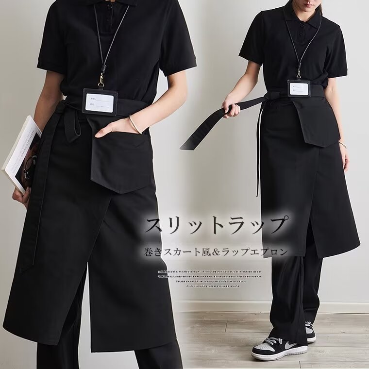 足元にスリットが入っている動きやすい エプロン ユニフォーム ウェイター用 ロング丈 エプロンスカート 制服 作業着 おしゃれ レストラン ショート丈 前結び カフェ ホール 居酒屋 料理店 ハ