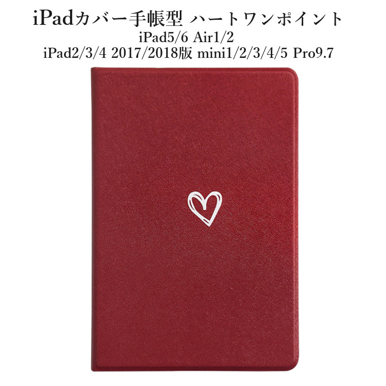 iPad ケース カバー 手帳型 小さなハートがかわいい シンプル 無地 レッド タブレットカバー iPad5 6 Air1 2 mini Pro9.7
